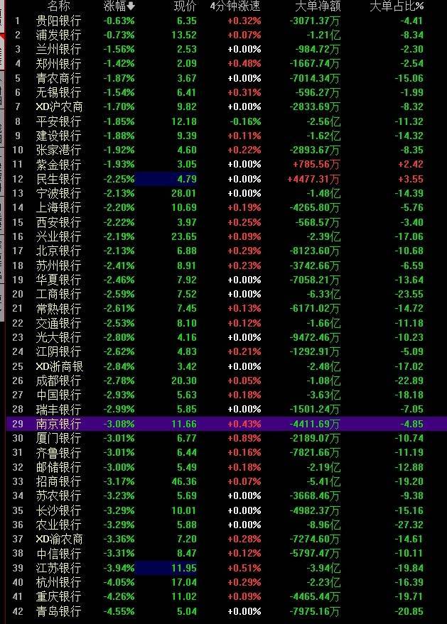 值得注意的是,自上午10点6分开始,沪指开始走软,出现小幅跳水,富时中国A50指数也翻绿。银行板块午后进一步下挫,青岛银行跌超4%,杭州银行、重庆银行、厦门银行跌超3%,南京银行、中信银行等多股跌超2%,42只银行股全线翻绿。