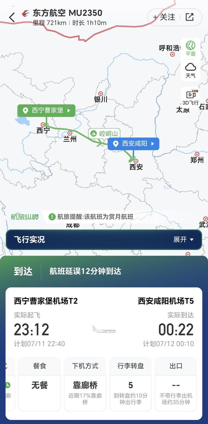 极目新闻记者查询航旅纵横APP发现,MU2350次航班原定计划起飞时间为7月11日22时40分,实际起飞时间为23时12分,实际到达时间为7月12日0时22分,延误了12分钟到达目的地西安咸阳机场。