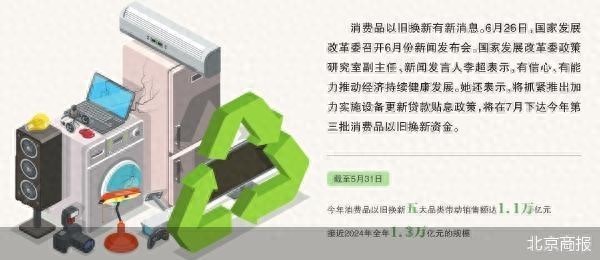 商务部数据显示,截至5月31日,今年消费品以旧换新五大品类带动销售额达1.1万亿元,接近2024年全年1.3万亿元的规模。